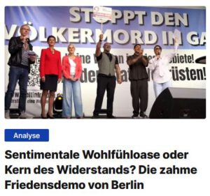 Es war bislang die größte Friedenskundgebung des Jahres in ganz Deutschland. Es traten Redner auf, denen man nur zustimmen kann. Zudem gab es viel Musik und gegenseitiges Schulterklopfen. Ist dieser weitere Versuch, die deutsche Friedensbewegung aus dem Lethargieschlaf zu wecken, trotzdem gescheitert? Dazu sollte sich jeder selbst ein Bild machen. Unsere Korrespondenten liefern eine Dokumentation der Ereignisse. von Astrid Sigena und Wladislaw Sankin, 19.09.2025 via RT – Weiterlesen!