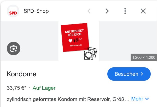 Der SPD-shop, der Fetisch- und Fanartikel-Vertrieb der Sozis, versüßt nicht nur die harte Parteiarbeit mit Kondomen, Badeente, Brausepulver, Gummibärchen, FliegenklatscheArbeitshandschuh & Bauzaunbanner (Brandmauer!), Seifenblasen, 17 cm Bildung, sowie Aufklebern „Demokratie zählt“ auf Ukrainisch und Russisch [sic!], sondern vermittelt offensichtlich auch Fortbildung und Personal Coaching.