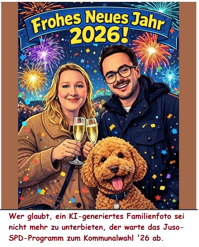 Der verschnullerte Juso-Politikbegriff gebar auch 2025 wieder einige Projekte von beträchtlicher politischer Reichweite: Mit der Beleidigung von MdB Anne Janssen („Brandmauer“) erfolgte das Abtauchen zu Jusos Wittmund im Februar, dann ein Ausflug zur Wittmunder Gesundheitsmesse, zu einer sog. Klausurtagung mit Frühstück, Austausch u. Erzählungen aus Politik und Verwaltung, 1 TikTok-Statement zu politischer Stadtreinigung,1 Stammtisch, 1 OV-Vorstandswahl und 4 fb-Lesetipps in strukturellem Analphabetismus.