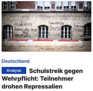 Kritiklos wird in dem Koalitionsvertrag mehrfach die Bindung zur NATO und zu den USA beschworen, auch zu Großbritannien und Frankreich; dagegen soll – in Anbiederung an Washington – die „destruktive Rolle“ des „iranischen Regimes“ in der Nahost-Region zurückgedrängt werden. Und Deutschland soll „wegen seiner geografischen Lage in Europa“ als „zentrale Drehscheibe der NATO weiter ausgebaut“ werden. Die Ausgaben für Verteidigung sollen „deutlich und stringent“ steigen und für „eine Wehrerfassung und Wehrüberwachung die Voraussetzungen geschaffen werden“.