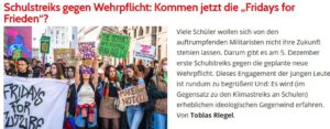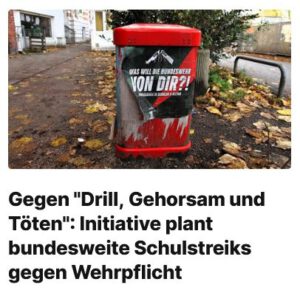 Bundesweit rufen zum 5. Dezember Jugendbündnisse zu Kundgebungen und Demonstrationen und Schülerschaften zu Schulstreiks gegen die Wiedereinführung der Wehrpflicht auf; sie werden in vielen Städten dabei von lokalen Nein-zur-Wehrpflicht-Bündnissen, Gewerkschaften und Friedensinitiativen unterstützt.