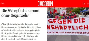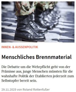 Wer die Verknüpfung von Krieg und Faschismus nicht begreift, leugnet auch die derzeitige Verstetigung faschistischer Strukturen einhergehend mit den derzeitigen Kriegsvorbereitungen – und begrüßt Wehrpflicht und Mobilisierung gewiß als jugendemanzipatorisches Gemeinwesenprojekt.