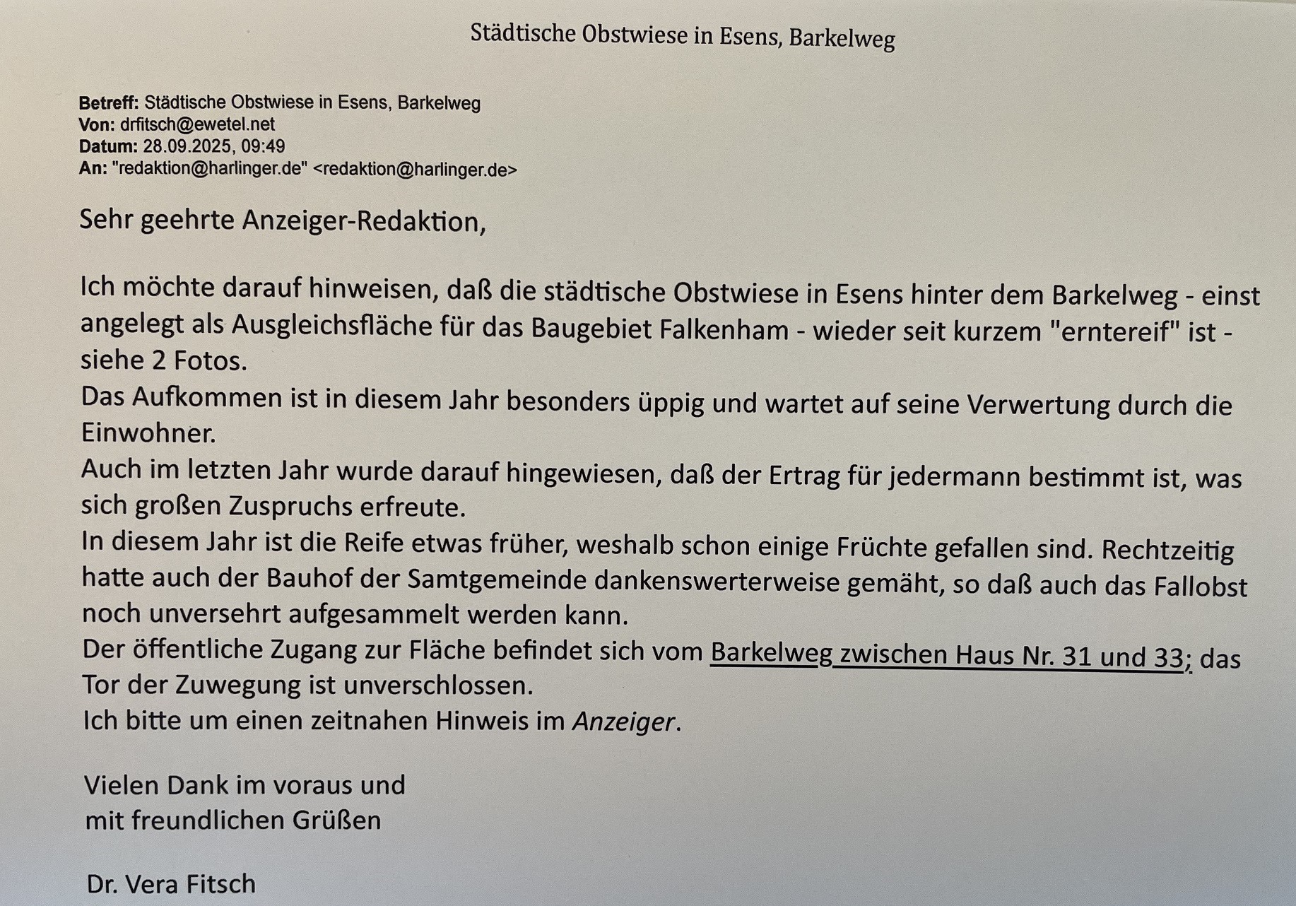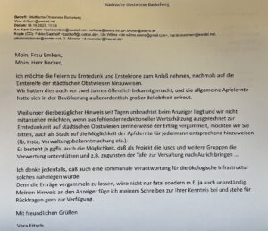 Allen voraus der Anzeiger, der ob redaktioneller Einfalt auch sonst wenig zustandebringt, was Intelligenz beansprucht, vermag somit seinen Beitrag zu dezidierter Lebensmittelvernichtung zu leisten, indem der freundliche Hinweis vom 28.09. als legitimer Ernteaufruf an die Bevölkerung dort aufbewahrt wird, wo auch die anderen unerwünschten Zuschriften landen, nämlich im Nirvana-Ordner.
