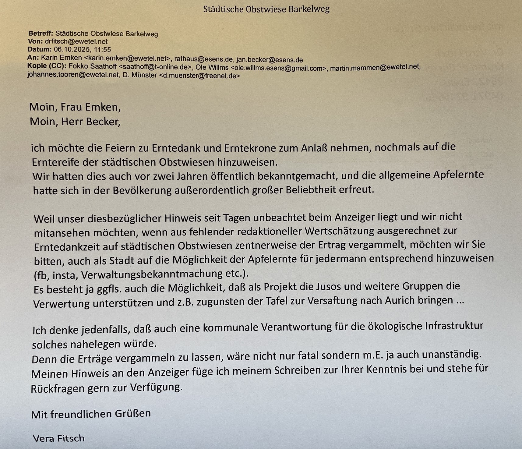 Nunmehr hat auf Nachfrage Esens‘ Stadtdirektor Jan Becker in Aussicht gestellt, eine Kollegin werde „sich dem Thema annehmen und über unsere Social Media Kanäle berichten.“