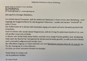 Die städtische Obstwiese am Barkelweg ist jederzeit zugänglich, der Ertrag ist für jedermann, der Zugang ist zwischen den Hausnummern 31 und 33, das Tor ist unverschlossen; die Äpfel sind, je nach Sorte, bis in den Februar lagerfähig!